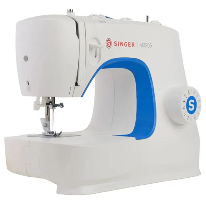 máquina de coser Singer M3205 es un equipo doméstico potente y versátil, con 23 puntadas utilitarias, elásticas y decorativas, brazo libre, enhebrador automático, selector de puntada ajustable y estructura metálica robusta para estabilidad y durabilidad.